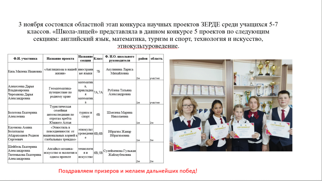 3 ноября состоялся областной этап конкурса научных проектов ЗЕРДЕ среди учащихся 5-7 классов. «Школа-лицей» представляла в данном конкурсе 5 проектов по следующим секциям: английский язык, математика, туризм и спорт, технология и искусство, этнокультуроведение.